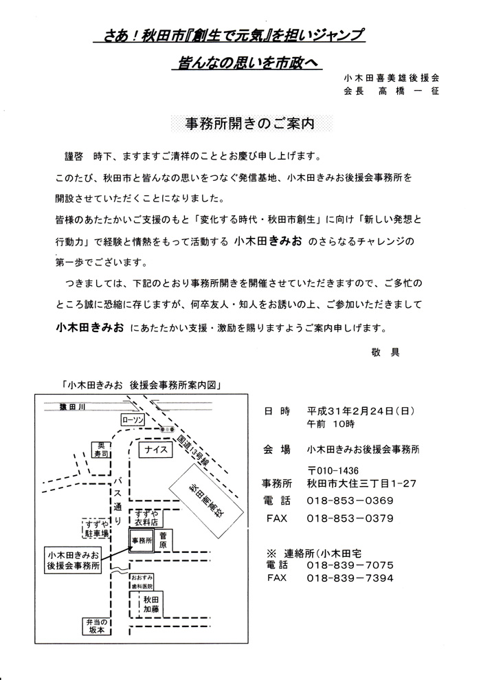 小木田喜美雄君は「皆んなの思いを市政へ」を理念に四期16年間初心を忘れることなく秋田市の街づくり、活力づくりに一生懸命頑張っております。